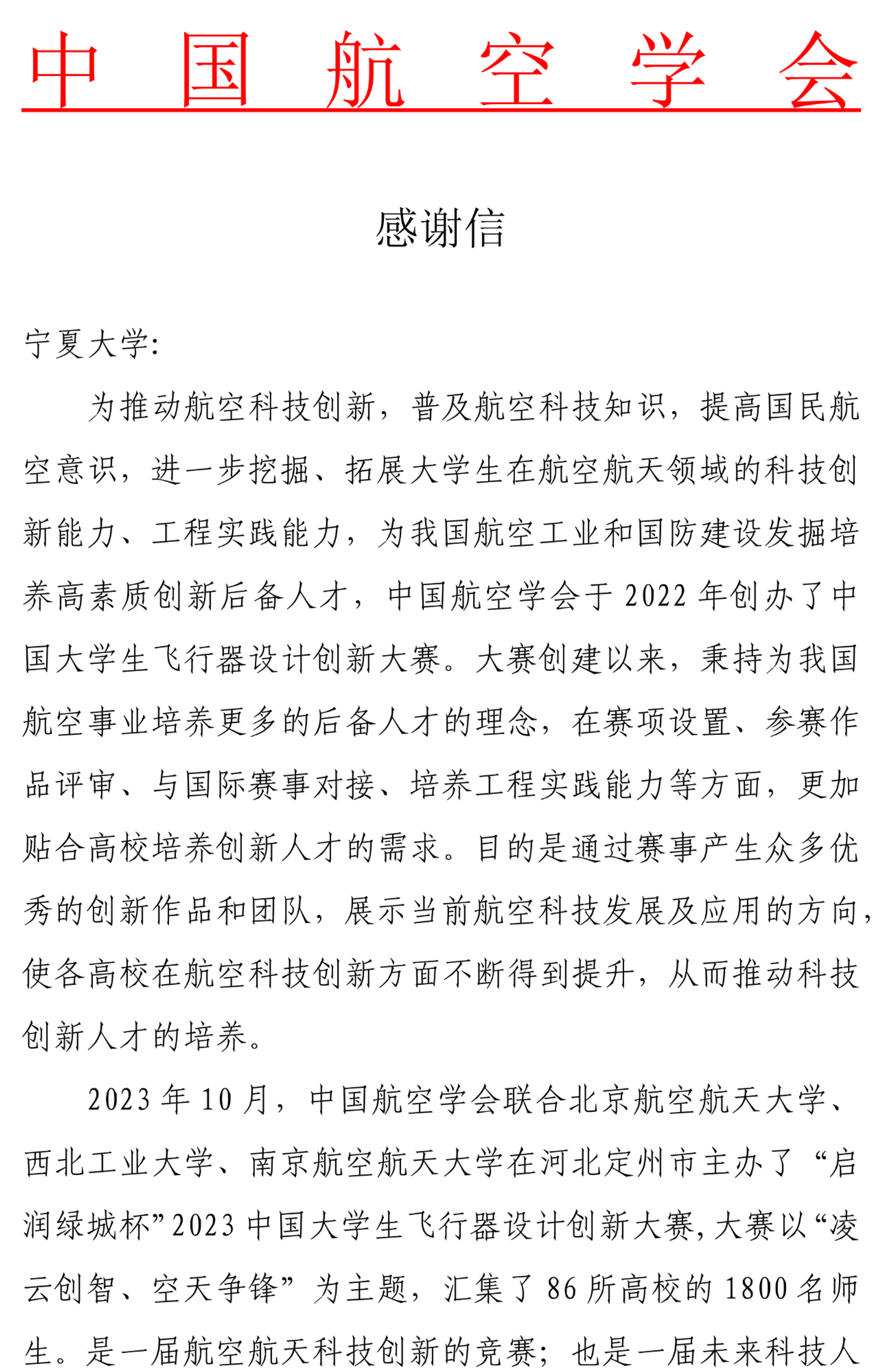 【电院讯 万艳妮/文、图】近日,中国航空学会向世界杯8833300足球发来感谢信。对公司长期以来支持和帮助对中国航空学会主办的航空科技赛事表示衷心感谢,对公司张虹波老师对大赛提供的专业技术支持和宝贵经验表示诚挚谢意。